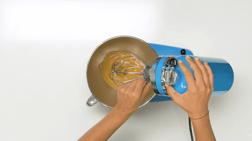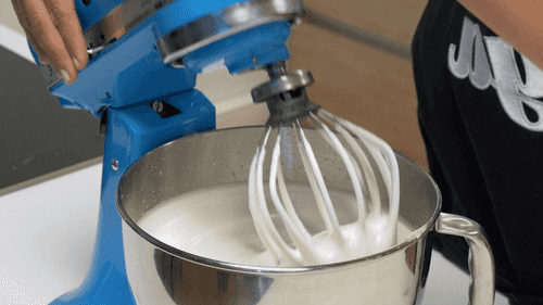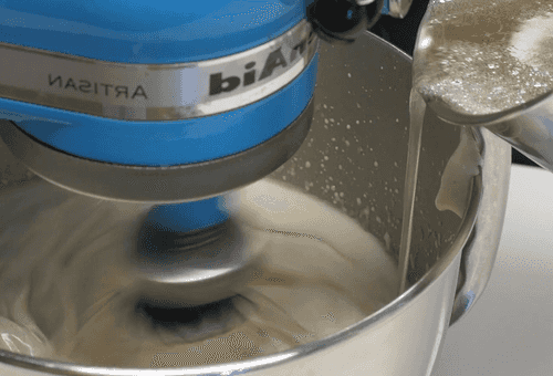While continuing to whip at maximum speed, pour the hot syrup into the egg whites in a thin stream, trying not to hit the whisk.