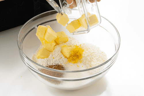 In a large bowl, mix flour (175 g), coconut flakes, regular sugar (50 g), and brown sugar (40 g) with the grated zest of half a lemon. Add diced cold butter and rub into crumbs. Add milk and mix again.