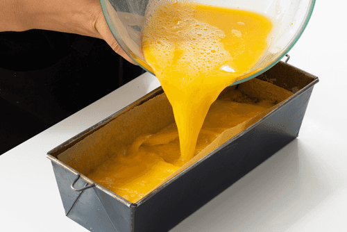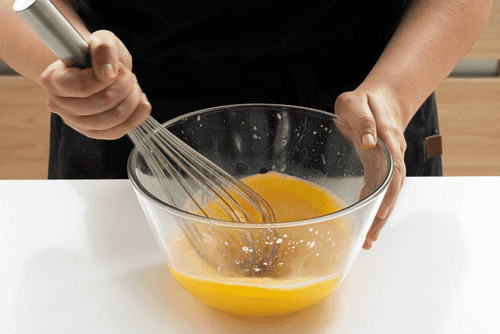 Beat the eggs with lemon juice into a fluffy pale mass. In a separate large bowl, mix the remaining sugar (200 g) and flour (25 g), adding the zest of three lemons. Sift the egg mixture into the dry ingredients and mix thoroughly with a whisk.