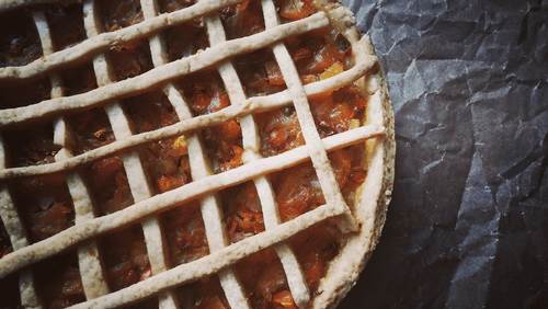Roll out the remaining dough to the same thickness and cut it into thin 'noodles'. Lay the strips of dough over the filling in a lattice pattern, securing them at the edges of the crust.