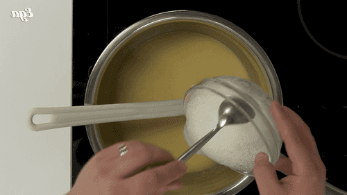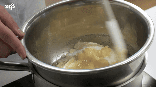 Melt sugar, honey, and butter in a water bath until the sugar is completely dissolved.