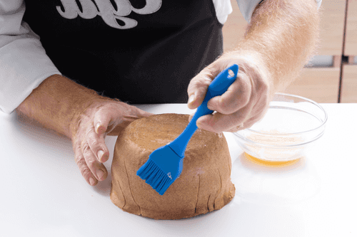 Take the finished plate out of the pot, pour out the beans, and grease it with egg. Return to the oven for 2 minutes.