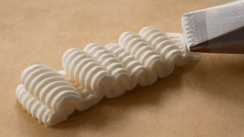 Whip the cream with powdered sugar until stiff peaks form — start at a low mixer speed and gradually increase to maximum.