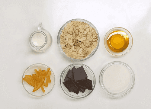 Remove the saucepan from the heat, add almonds and candied fruits, and mix well.
