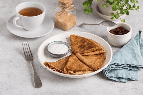 Cook pancakes on a dry skillet, preferably a crepe pan, preheating on high heat. Fry for 1.5 minutes on each side.