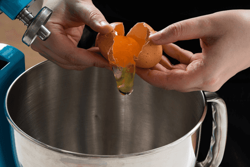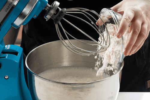 Pour in cold milk without stopping the mixer.