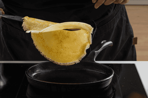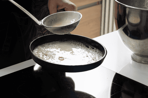 Heat the pancake pan — for the first pancake, you can grease it with vegetable oil, and you can fry the subsequent ones without it. Pour a little batter onto the pan and spread it over the entire surface.