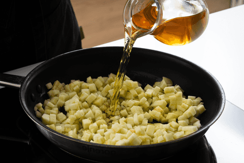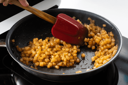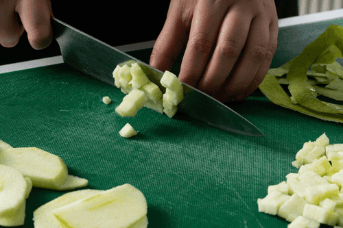 Peel the apples and remove the seeds, then cut them into 5 mm cubes.