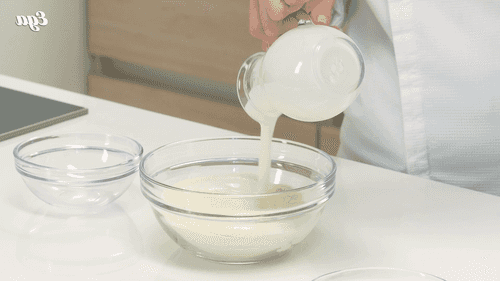 Pour kefir over the semolina, mix it, and let it swell for 30 minutes.