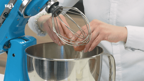 Pour sugar into the mixer bowl and continue beating until fluffy foam.