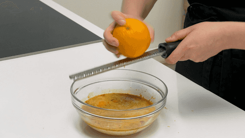 Mix milk, eggs, yolks, vanilla, and the zest of lemon and orange.
