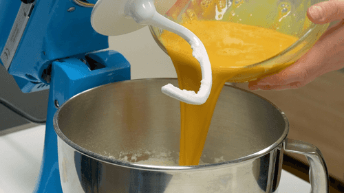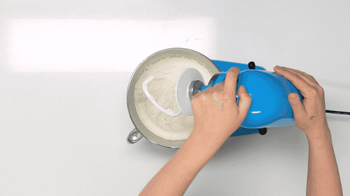 In the mixer bowl, add flour, sugar, yeast, and salt, and mix with the hook attachment.