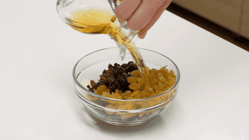 Mix the dried fruits and soak them in rum. Let them absorb until the dough rises for the first time.