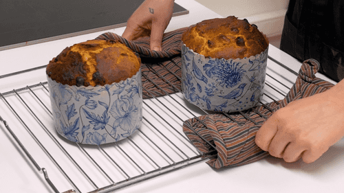 Insert two long skewers into the hot panettone through the paper form parallel to each other and the table. Turn the panettone upside down and hang it on the skewers over a large pot. It should not touch the sides or bottom of the pot. Allow it to cool completely.
