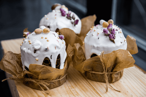 Place the dough in molds and bake for 30 minutes at 165 degrees. Cool the finished kulich and optionally decorate with sugar glaze, nuts, candied fruits, and dried flowers.