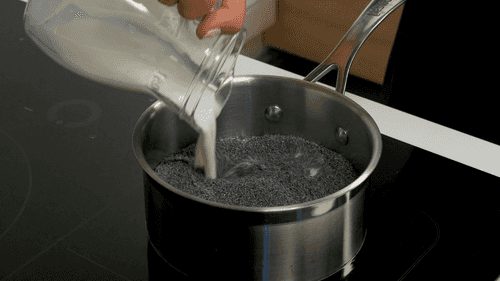 For the filling, place poppy seeds in a saucepan, pour in milk, mix and put on the heat. Cook on low heat for 15 minutes.