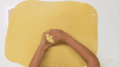 Evenly spread softened butter on the dough, then with poppy paste.