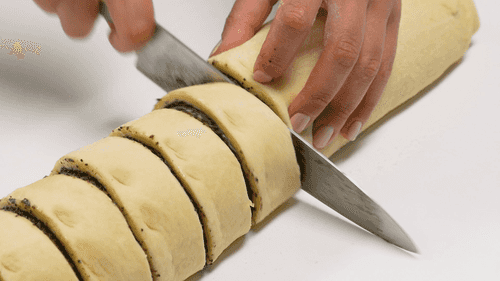 Roll the dough into a log and cut it into 5 cm wide pieces. Place them on a baking sheet lined with parchment.