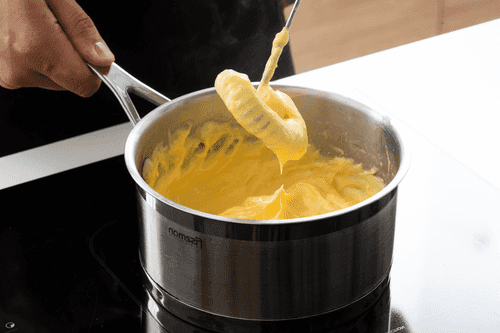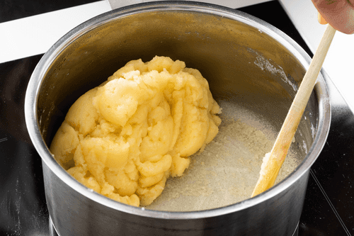 Return to medium heat and dry the dough until a crust forms on the bottom of the saucepan. Transfer the resulting mass to a bowl or mixer bowl and let it cool to 50-55 degrees.