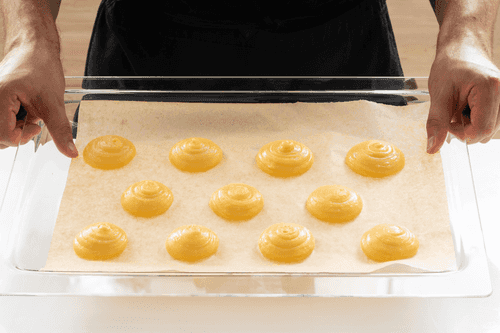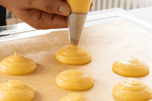 Transfer the dough to a piping bag with a 'closed star' tip and pipe round bases for pastries (about 6-7 cm in diameter) onto a parchment-lined baking sheet.