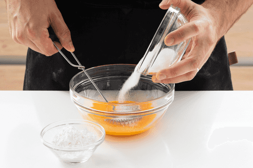 Whisk the yolks with 50 g of sugar until pale. Add starch and mix thoroughly to avoid lumps.