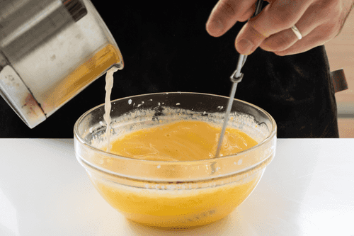 Remove the vanilla from the saucepan with milk. Add about a third of a cup of milk to the yolks, mix thoroughly until smooth, and then pour the resulting mixture into the saucepan with milk, remembering to whisk the mixture.