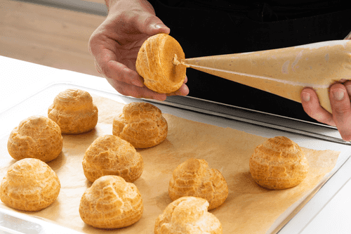 Put the cream in a pastry bag and fill the pastries with cream through the hole at the bottom.
