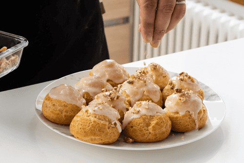 Add about 50 g of nut praline to the cream and mix thoroughly to distribute the praline evenly. Cover the bowl with plastic wrap touching the surface of the cream, cool completely, and place it in the refrigerator. Before filling the pastries with cream, take it out of the fridge and mix with a mixer to incorporate air and make it fluffier.