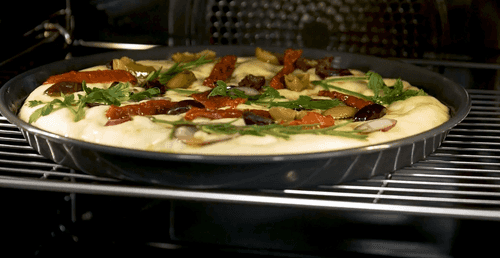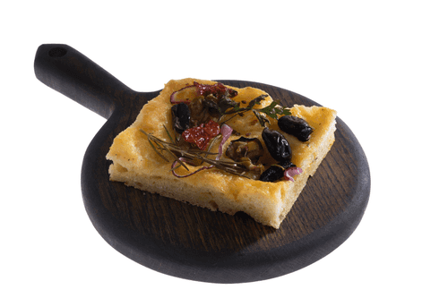 Send the focaccia to a convection oven preheated to 235 degrees with steam mode. After 5 minutes, turn off the steam and bake for another 30 minutes.