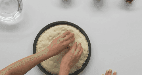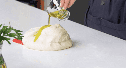 When the dough has fully risen, it should be placed in a baking pan generously greased with olive oil. Spread it evenly without overdoing it, cover with a towel or the same pan, and leave for 2 hours at room temperature.