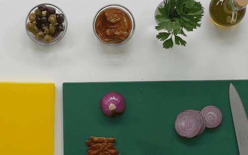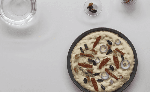 While the dough rises, prepare the vegetables. Slice the onion and olives into rings. Cut the sun-dried tomatoes if they are too large.