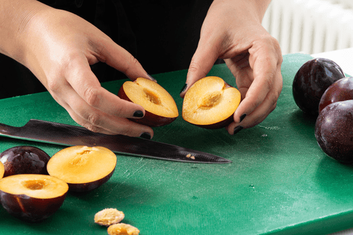 Cut the plums in half and remove the pits.