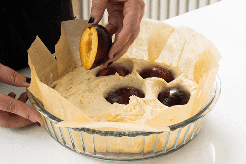Place the halves of the plums on the dough and gently press them in.