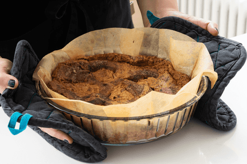 Line a mold with a diameter of 23-25 cm with parchment and grease it with butter. Place the dough on the parchment.