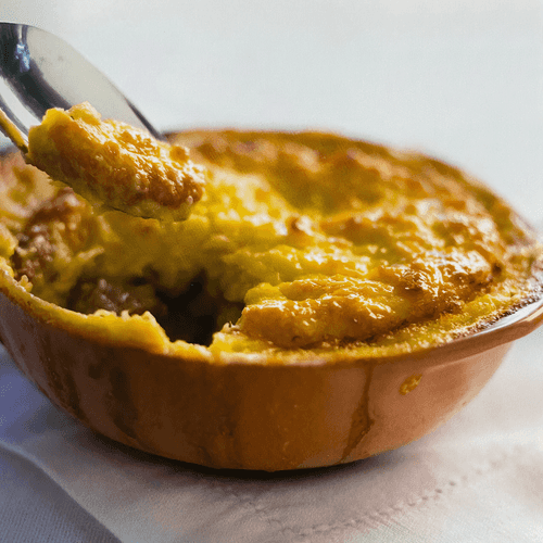 Sweet corn pie is a traditional dish of Latin American cuisine, especially popular in Chile. It combines the tenderness of corn puree with the rich flavor of meat filling called 'pino'. The flavor palette of the pie surprises with contrasts: the sweetness of corn and raisins harmonizes with the saltiness of olives and the spiciness of spices. In the original recipe, sugar is sprinkled on top to create a light caramelized crust. This pie is served hot, and its chewy texture makes it a truly cozy dish. It is perfect for both family lunches and festive gatherings, as its rich taste leaves no one indifferent.