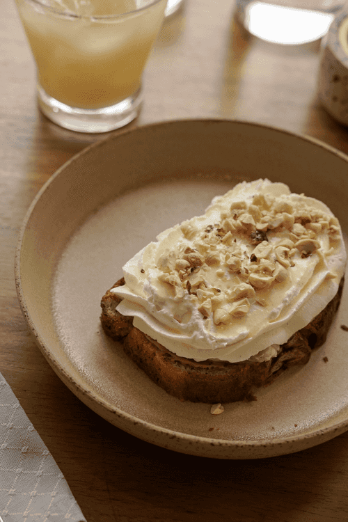 Cut the ready bread into eight portions, spread each piece with peanut butter, and top with thinly sliced banana. On the banana - whipped cream.