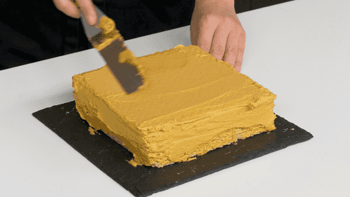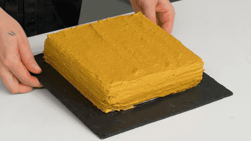 Spread cream on the waffles and assemble the cake.