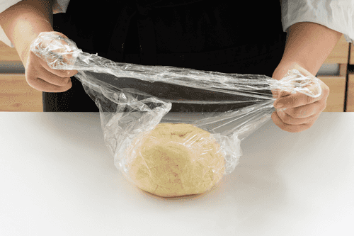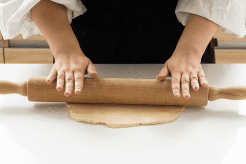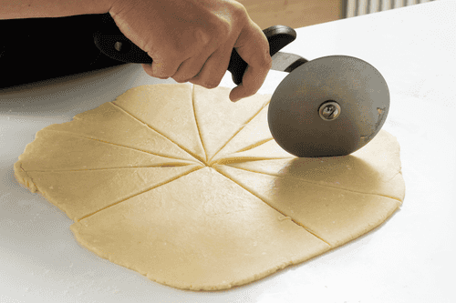Take the dough out of the fridge. Cut it into two parts, put one back in the fridge, and roll the other into an even circle.