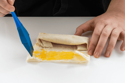 Brush the other edge of the lavash with egg yolk and firmly stick it to the tube.