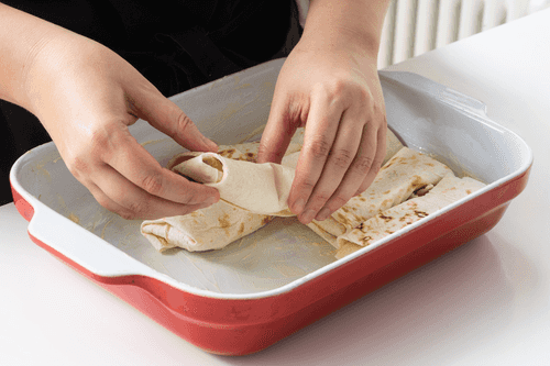 Grease the bottom of the baking dish with butter, and lay the lavash tubes seam side down in one layer.