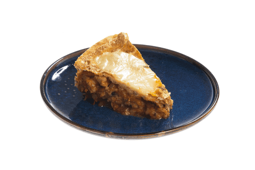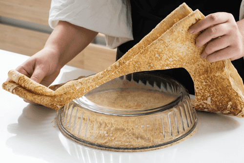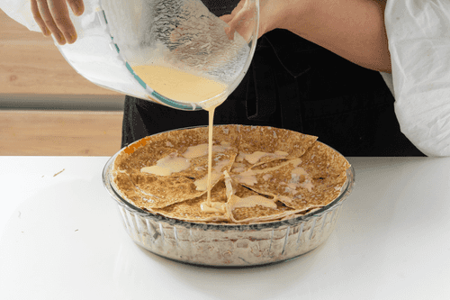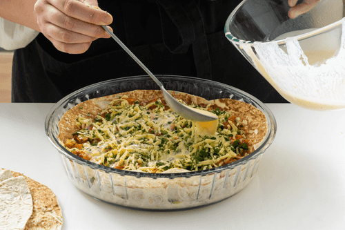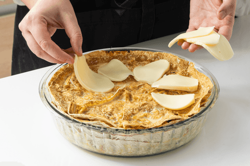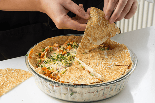 Layer all four layers of the pie. Cut the last round of lavash into portioned segments to make it easier to slice the pie.