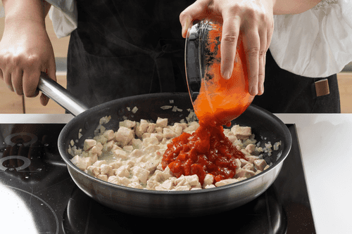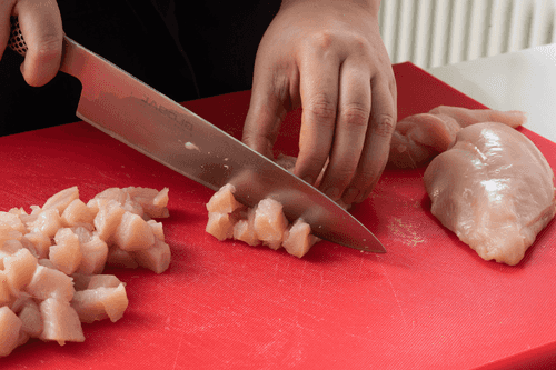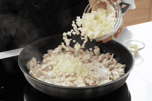 Cut the chicken into one-centimeter pieces, place them in a heated pan with vegetable oil, and fry while stirring until it turns white.