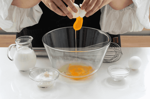 Crack 3 eggs into a bowl, add kefir, sour cream, salt, pepper and mix well with a whisk.
