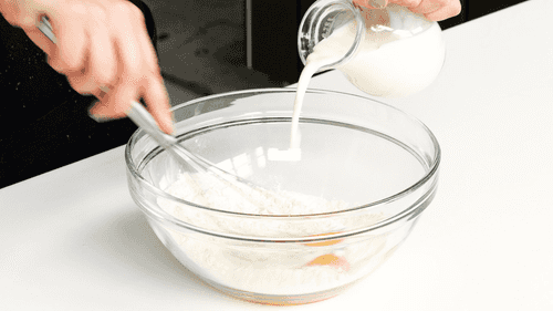 Mix milk, egg, salt, sugar, flour, and baking powder with a whisk.