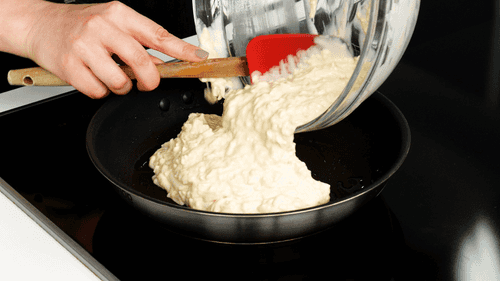 Heat the pan, grease it with vegetable oil, and pour in the batter. Cover with a lid and fry on low heat for 7-8 minutes. The bottom should brown and the top should set.