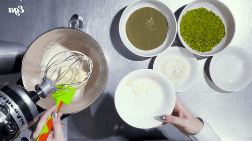 Crush the pistachios in a blender into a mass with pieces. Add flour and 130 grams of pistachios to the mixer bowl and mix everything together at low speed.