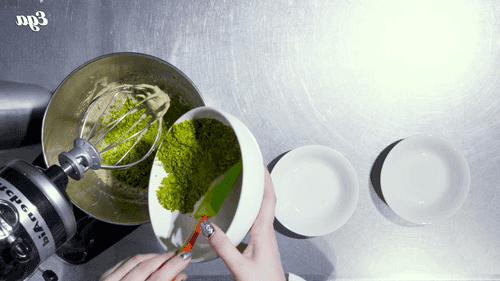 Add softened butter (if taken straight from the fridge, it can be softened in the microwave), 100 grams of pistachio paste and mix until smooth, remembering to occasionally scrape down the sides of the mixer bowl from the stuck mass. This will take about 5 minutes.