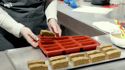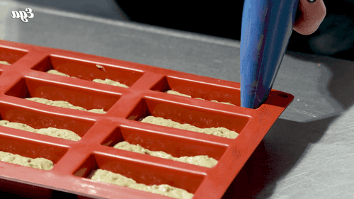 Fill special rectangular molds with financier batter from the bag. If there are no special molds, you can bake the financier in one large mold and then cut it into bars. Bake the cupcakes in a preheated oven at 160 degrees for 12-15 minutes, or about 20 minutes if using a large mold. Check readiness with a skewer: if it comes out dry, the cupcakes are done.