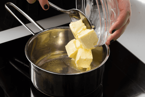Melt the butter in a saucepan. Reduce the heat and cook until the butter has a nutty aroma and brown particles settle at the bottom.
