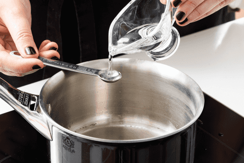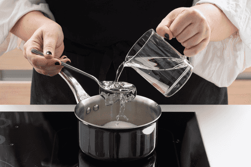 In a pot, mix 2 tablespoons of water and sugar. Keep on medium heat until the sugar dissolves.